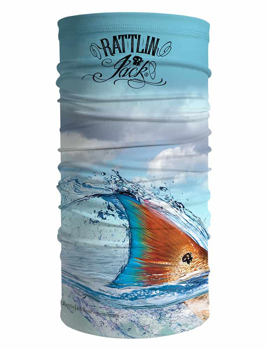 Rattlin Jack's Redfish designs on UV fishing shirts capture the thrill of seeing the redfish tailing in skinny water of the estuaries, grass flats, and tidal creeks of the Southern States.